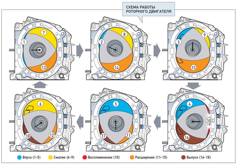 У двигуні Ванкеля роль своєрідного поршня виконував трикутний ротор. Він обертався у нерухомому корпусі, що має особливу конфігурацію. Під час роботи там періодично утворювалися змінні за обсягом порожнини, у яких послідовно здійснювалися всі стадії чотиритактного процесу.