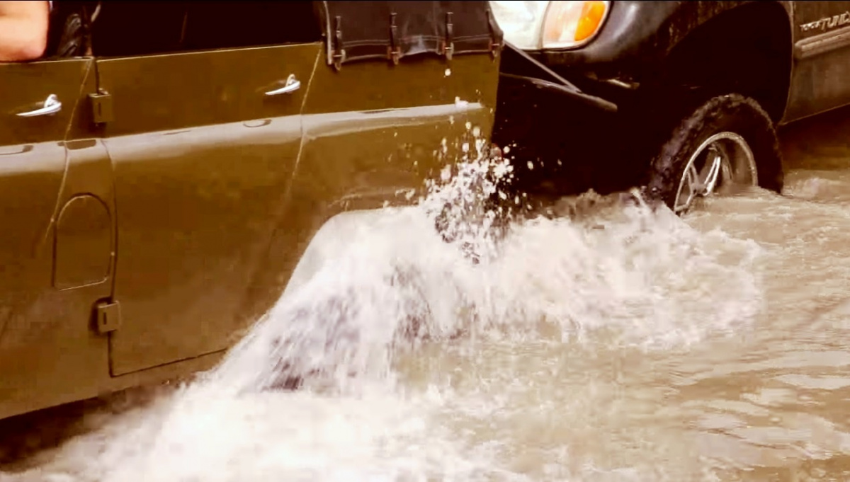 Заехать на внедорожную трассу может любой желающий на джипе. Все что нужно, это заплатить 15 долларов и не съезжать с обозначенного маршрута. Одним из самых эффектных препятствий является преодоление небольшой речки. Вот здесь советский «козлик» и опозорился, застряв прямо на середине водоема. Оказывается, у машины не включился передний мост и она уперлась колесами в камни. Хорошо, что на выручку пришел пикап Toyota Tundra.