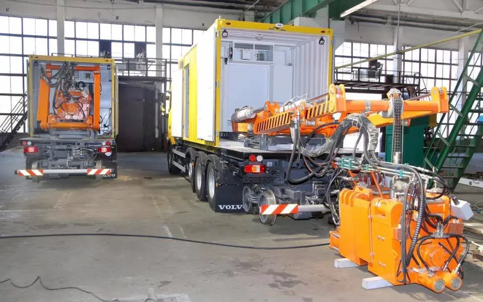 Отметим, что КЗЭО имеет в производственной линейке двухдорожное транспортное средство, которое может работать на железнодорожных путях. В качестве базы применяются шасси Volvo – в частности, модели FMX. Для движения по рельсовому полотну используется система привода двух типов на выбор: фрикционная (от ведущих колес автомобиля) и гидростатическая (от гидромоторов на осях железнодорожных тележек). В данном случае используется гидростатический тип.
