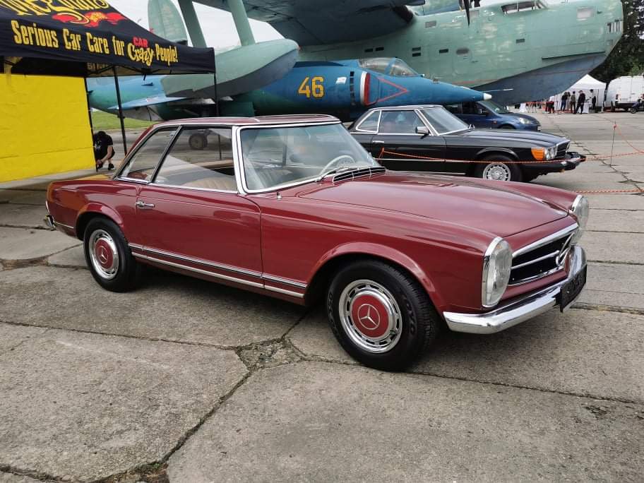 Индекс SL расшифровывается как Super Light («сверхлегкий»), так как капот, двери и крышка багажника были изготовлены из алюминия. Модель 230 SL имела «шестерку» рабочим объемом 2,3 л мощностью 150 л.с. и могла развивать 195 км/ч. Интересно, что Mercedes-Benz впервые предложил на автомобилях такого типа автоматическую коробку передач (опция). Представленная на выставке модель имеет оригинальную съемную жесткую крышу. Эти машины также выпускались и с брезентовом верхом. Всего в 1963 – 68 гг. выпущено 19 831 автомобиль модели 230 SL.