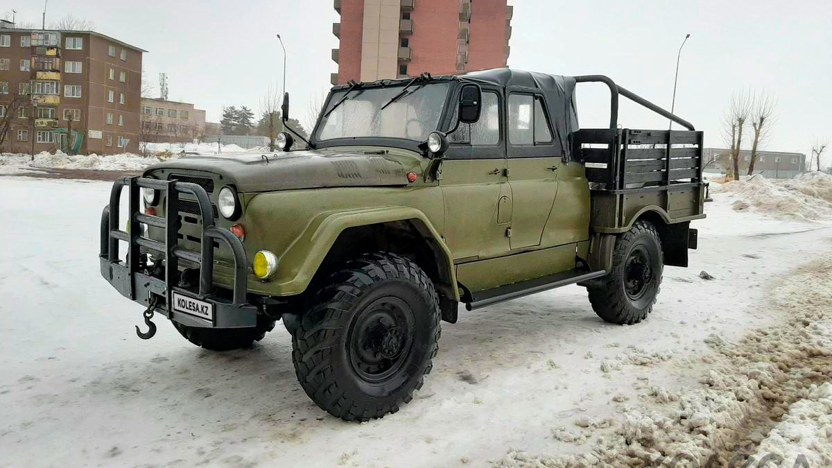 Только посмотрите на этот уникальный внедорожник, который сегодня продается в Казахстане за 20 тысяч долларов с небольшим. Первое, что мы видим – кузов от УАЗ-469, который смонтировали на шасси грузовика, а точнее ГАЗ-66. Передние крылья взяты от еще одного армейского донора – ЗИЛ-131 (6х6).