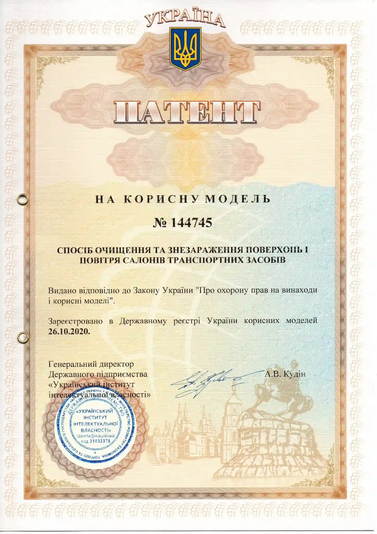 ГП "Автосборочный завод № 1" АО "АК" Богдан Моторс "получило патент на полезную модель"Способ очистки и обеззараживания поверхностей и воздуха салонов транспортных средств ". Патент издан в соответствии с Законом Украины "Об охране прав на изобретения и полезные модели" и зарегистрирован в Государственном реестре Украины полезных моделей.