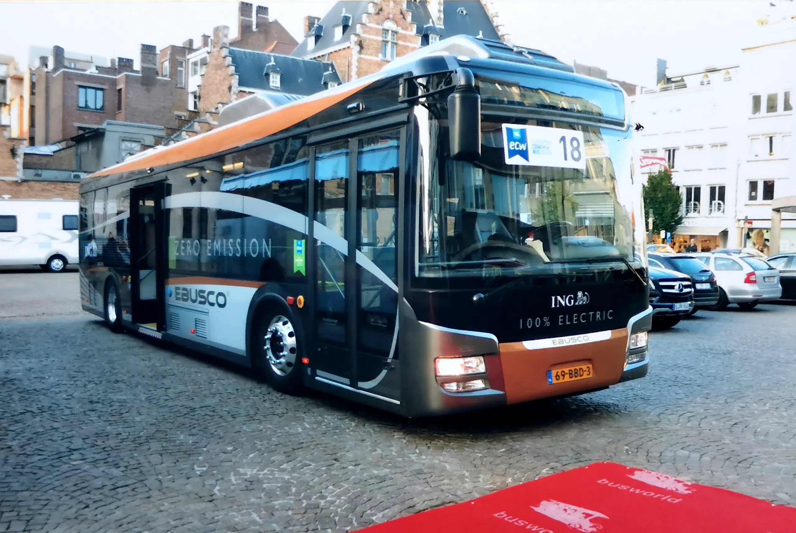 Електробус Ebusco 1.0 на вулицях Кортрейка, жовтень, 2013 р. Мотор — 150 кВт. Батареї — 242 кВт.год. Запас ходу — 250 км. Дизайн розроблений студією Kessels Granger Design Works.