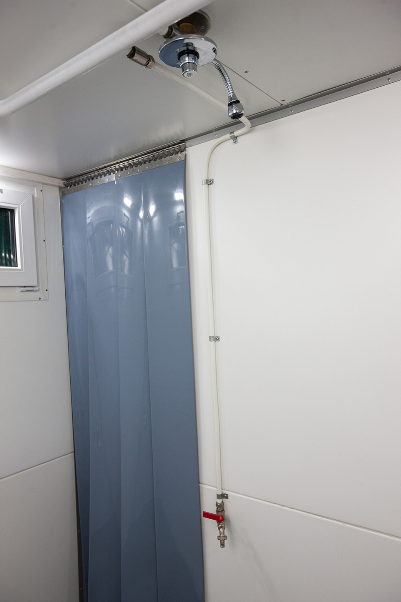 А стосовно модулів-контейнерів, то в одному з них змонтовані дизель-генераторні установки для автономної роботи, а також обладнання для підключення до зовнішньої мережі. У другому модулі розташоване мобільне банне приміщення, в якому передбачена можливість нагріву води за допомогою рідкого або твердого палива.