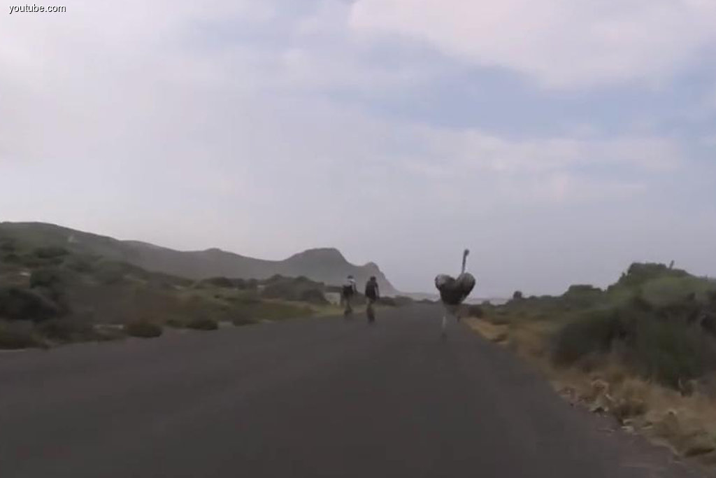Во время тренировочного заезда велосипедистов в Южной Африке перед Кейптаунским велотуром к ним на трассе неожиданно присоединился страус. Один из участников велогруппы – Олексий Мишченко из Цюриха (Щвейцария) снял эту зрелищную и юморную гонку. Видео, опубликованное в Youtube 5 марта, буквально за несколько дней набрало более 2 млн просмотров, а на сегодня – почти 4,5 млн. В ролике видно, как огромная птица, виляя длиннющими ногами, очень долго бежит за перепуганные спортсменами, которым не удается от нее оторваться, а потом – страус марафонец победно сходит с дистанции и замедляет темп.