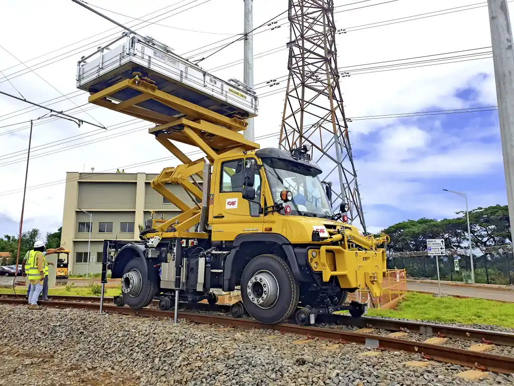 Поэтому поставленные четыре Mercedes-Benz Unimog работают на этой трамвайной линии. Две машины оборудованы подъемными платформами для обслуживания контактной сети, а две других предназначены для эвакуации поломавшихся вагонов.