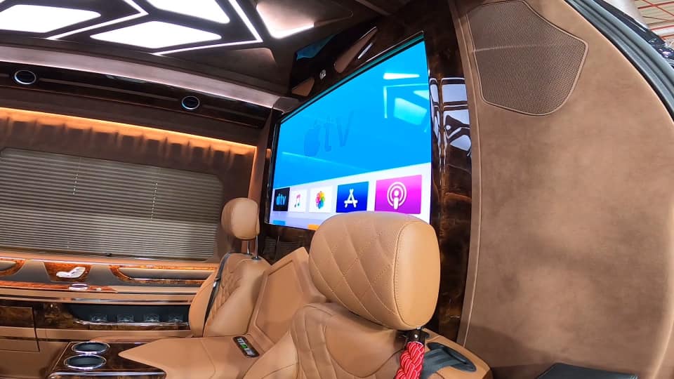 Также хочется упомянуть и еще один автобус на базе Mercedes-Benz Sprinter третьей генерации – от кузовного ателье Edurman. В данном случае это уже не маршрутка, а настоящий VIP-шаттл. В салоне – море кожи и натурального дерева. Кабина водителя отделена от “кабинета” перегородкой с большим телевизором.