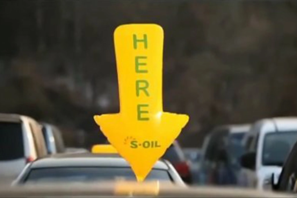 Необычный способ поиска свободного места на парковке внедрила одна из заправок в Южной Корее. Ярко-желтая надувная стрелочка с надписью «Here» (здесь), привязанная на парковочном месте, поднимается в воздух и сигнализирует об освободившемся месте и опускается, если место занято. Увидев её, водитель сразу направляется к указанному месту, и ему больше не приходится нервничать, наматывая круги по стоянке.