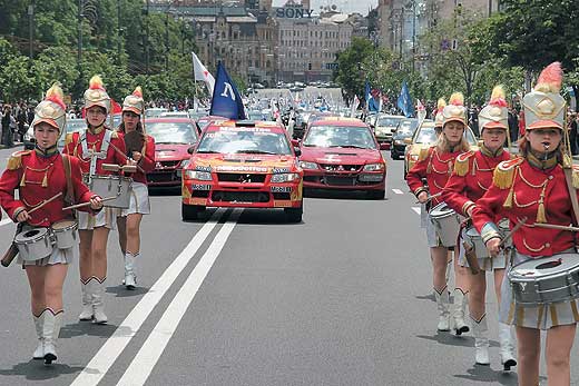 Участники выстроились в колонну по пять машин в ряд и приготовились совершить заключительный марш на пути к своей цели – рекорду Украины. «Стрела» из двенадцати спортивных Lancer Evolution VIII во главе с «боевым» автомобилем многократного чемпиона Украины по ралли Александра Салюка вела за собой колонну Mitsubishi. Машины вновь попали под дождь. Но на этот раз – из серебристого конфетти, которое сыпалось на них под бой барабанов.