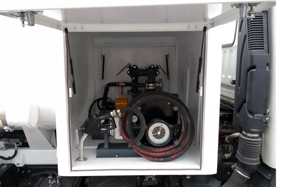 В комплектацию в частности входят рукав 1” на 10 м и два 4-метровых сливных рукава в пеналах. А также: счетчик, фильтр очистки топлива перед счетчиком, перепускной клапан, заправочный пистолет с отсекателем, противооткатная защита, ящик для песка, пенал для огнетушителя, стационарная лестница, подъемный поручень и трап на верху цистерны. Сверху на кабине установлен проблесковый маячок.
