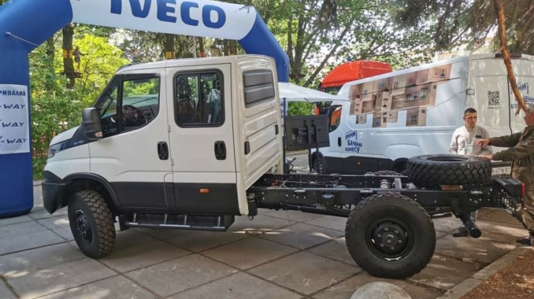 Рядом находится IVECO Daily 4х4, который выпускается на заводе в Бользано. Эти автомобили в основном идут в армию НАТО, а в нашем случае представлена гражданская версия. Машина предназначена для бездорожья – имеет три блокировки дифференциалов (межосевую и межколесные) и понижающую передачу. Шасси может быть застроено разными кузовами. В данном случает здесь установлена двойная кабина, возможна также одинарная или версия с цельнометаллическим интегрированным фургоном.
