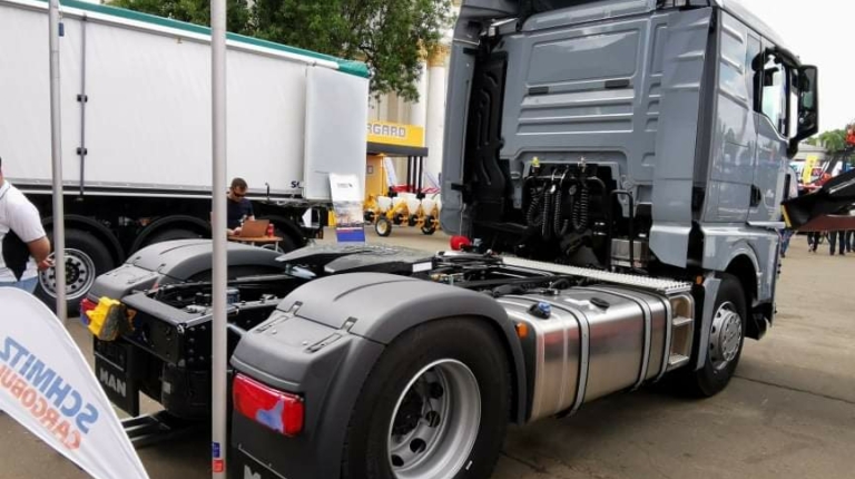 Компания «Технофорум» – официальный дилер MAN Truck and Bus в Украине привез на выставку седельный тягач TGX 18.440. Эта модель новейшего поколения Truck Generation представлена в исполнении Agro – для тяжелых условий эксплуатации. Здесь в частности установлен трехсекционный бампер, а фары спрятаны за защитными решетками. Под бампером имеется стальной поддон для защиты двигателя. Машина укомплектована 440-сильным двигателем (2100 Нм) стандарта Евро 5 и автоматической 12-ступенчатой коробкой передач MAN TipMatic, которая имеет ряд полезных функций, в частности движения накатом – EfficientRoll.