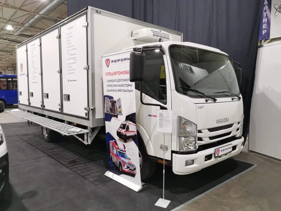 На недавней выставке ComAutoTrans 2021 в Киеве особый интерес посетителей вызвал стенд компании Reform – известного украинского производителя инкассаторских, медицинских и других специализированных автомобилей. В данном случае она презентовала интересные решения для перевозчиков. Прежде всего назовем автомобиль c мультитемпературным фургоном, установленным на шасси грузовика Isuzu NP.