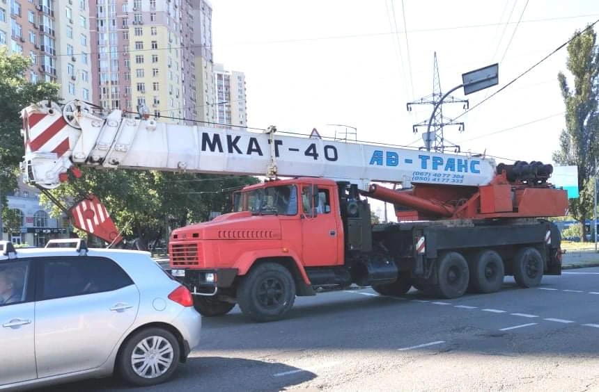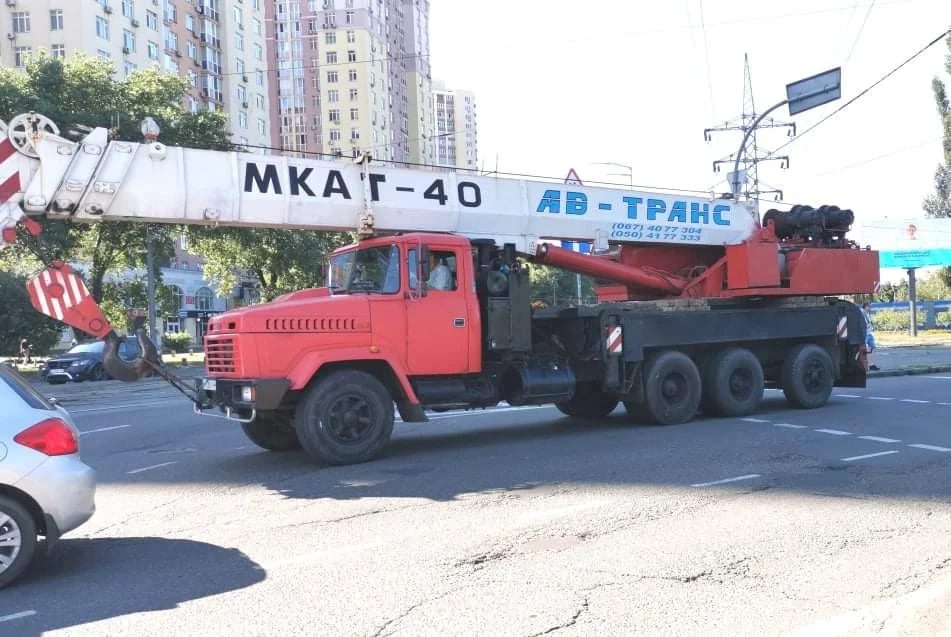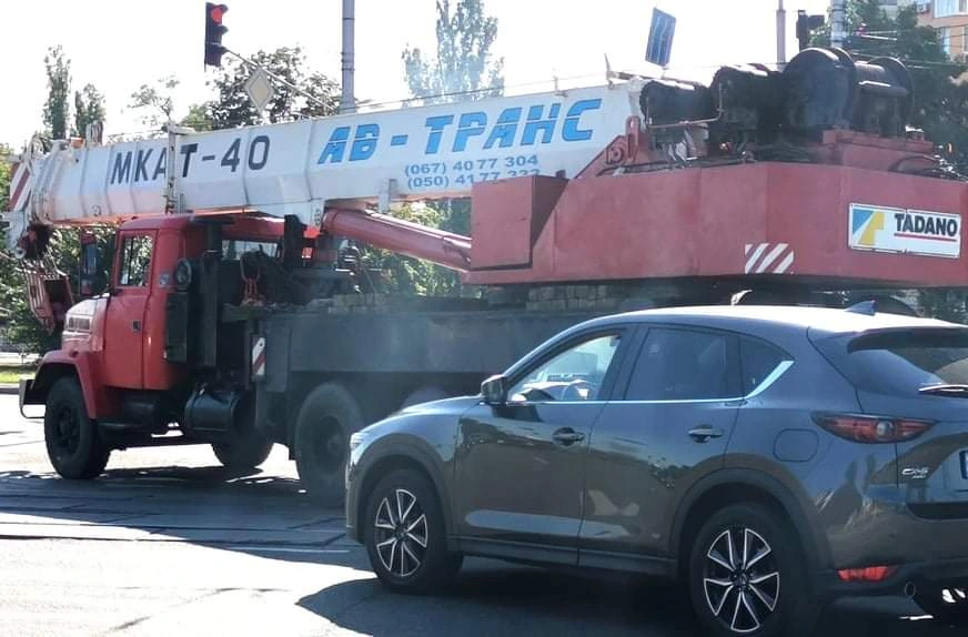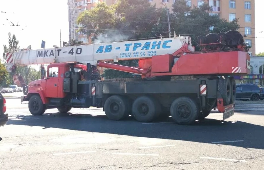 Вот такой, довольно редкий автокран нам удалось сфотографировать на днях в Киеве. Это модель МКАТ-40, в основе которой лежит шасси КрАЗ-65101 (6х4) с дополнительной, подкатной четвертой осью. Последняя является управляемой и позаимствована с грузовика МАЗ-5335. Ее поворот вместе с передними колесами осуществляется специальным гидроцилиндром.