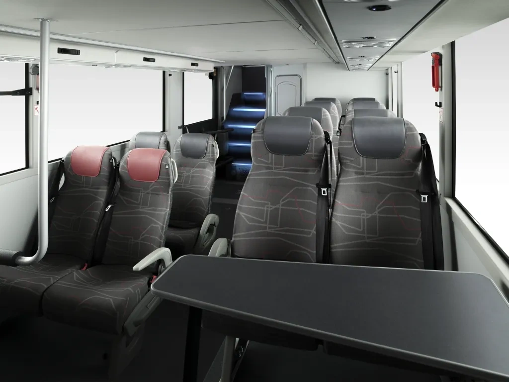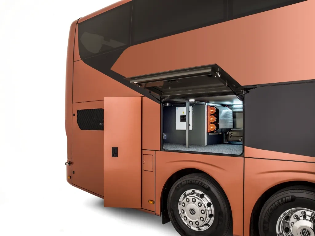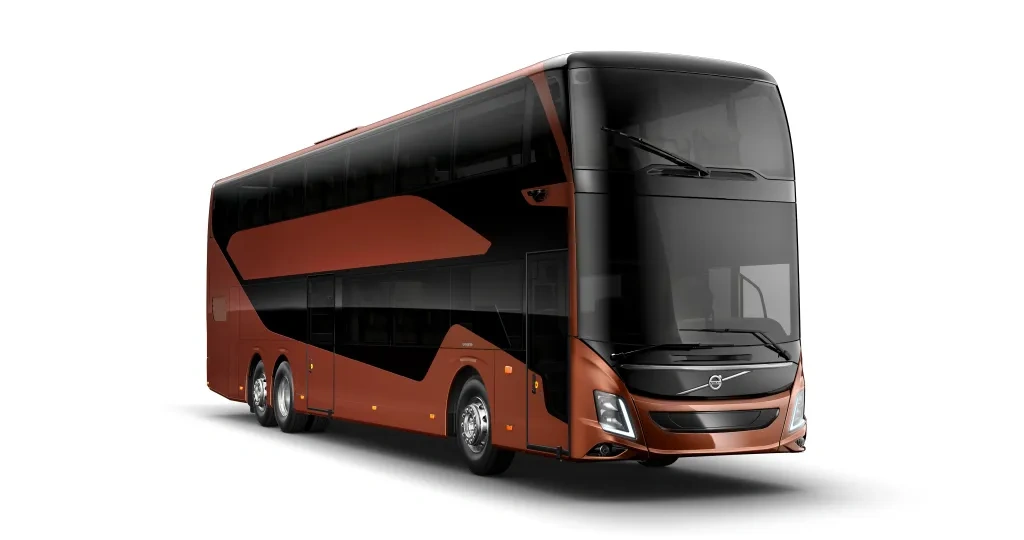Двухпалубник общей высотой 4,25 оснащен 10,7-литровым двигателем Volvo D11K460 мощностью 460 л.с. и максимальным крутящим моментом 1585 Нм при 1000 – 1400 об/мин. Он сертифицирован для работы на таких видах топлива как дизель, HVO (гидрированное растительно масло) и биодизель (B100). С двигателем работает автоматизированная коробка передач Volvo I-Shift AT2412F.