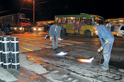 На выравнивающий слой кладут гидроизоляцию. Выглядит это так: люди с мощными газовыми горелками раскатывают рулоны изоляционного материала, а потом метр за метром расплавляют поверхность изолятора, «приваривая» его к асфальту.