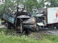 Два грузовика столкнулись и загорелись в пять часов утра второго июня в селе Зеленый Гай Дубенского района Ровенской области. Как сообщил инспектор ОГАИ УМВД Украины в Ровенской области Василий Петрик, грузовик ГАЗ-3307 с надписью “Молоко” на кузове внезапно выехал на полосу встречного движения и столкнулся с другим грузовиком ЗИЛ-130.