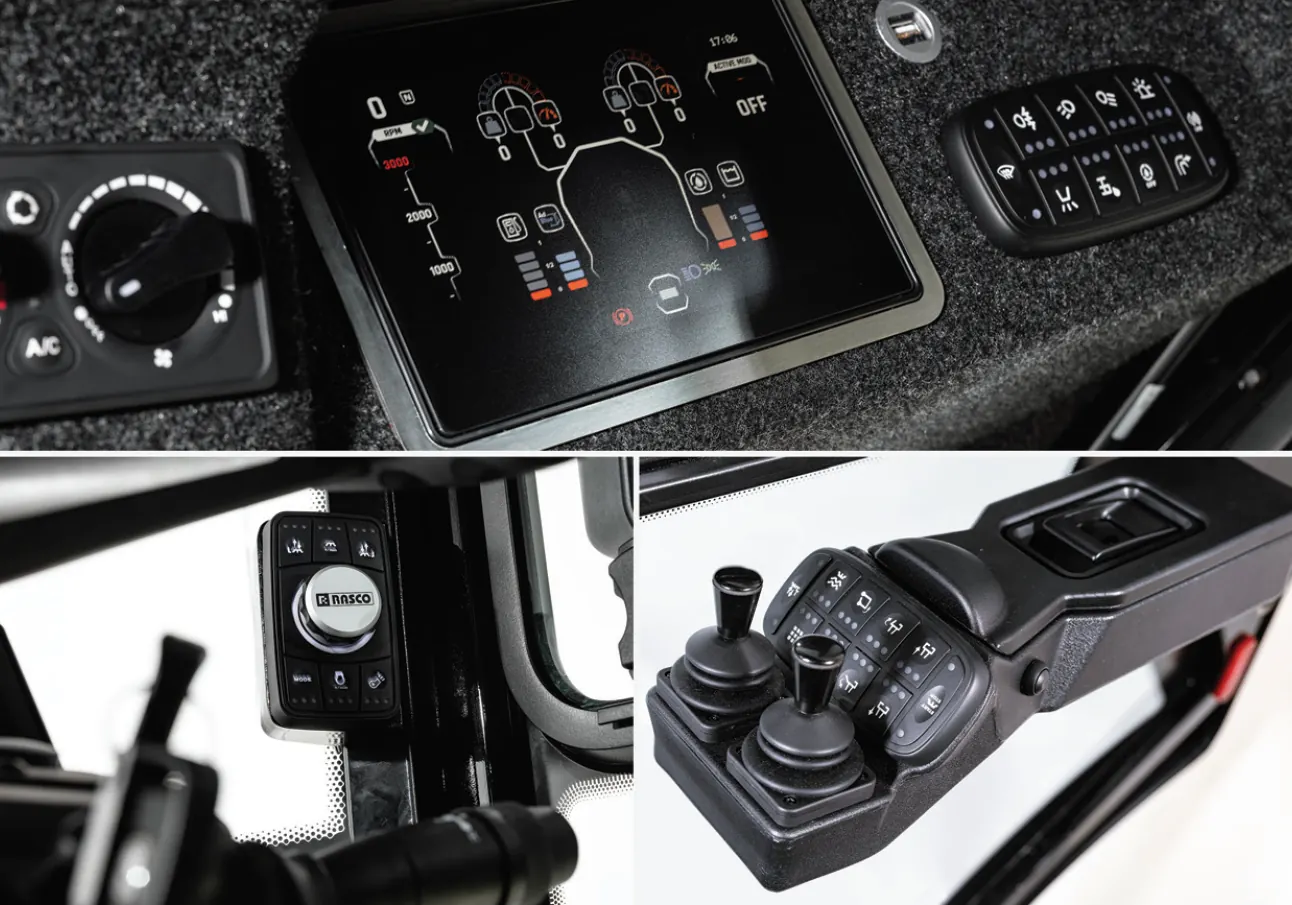 Кстати, эту третью щетку можно использовать и для уборки тротуаров, а также для скашивания сорняков (с металлической щеткой). Дополнительной «лапой» Lynx может пользоваться как с правой, так и с левой стороны. Скорость вращения щеток – от 0 до 125 об/мин. Управление щетками возложено на удобные джойстики, а наблюдать за рабочими параметрами можно по большому ЖК-дисплею в кабине оператора.