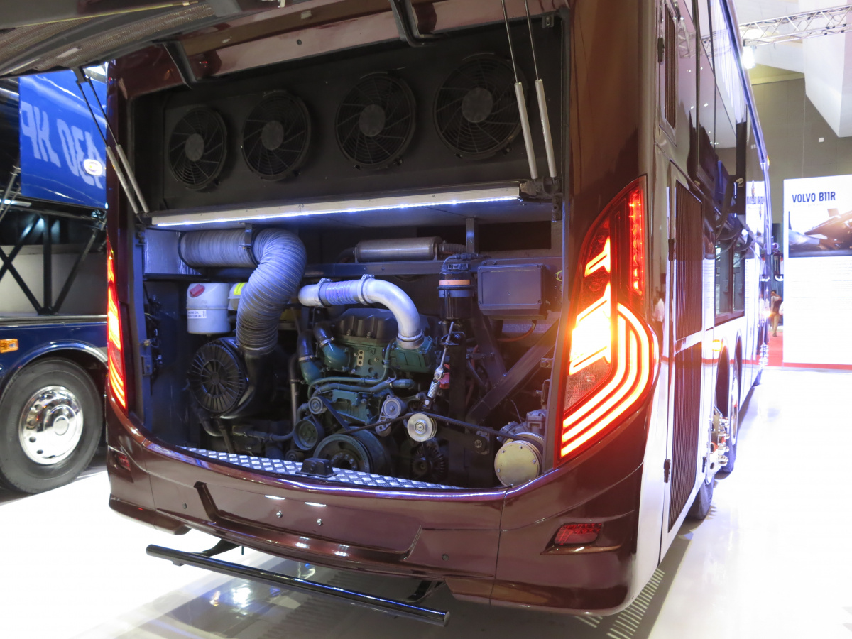 Большой стенд был и у Volvo Buses. Здесь также были презентованы различные шасси с местными, довольно экзотическими кузовами. Так, следует отметить двухэтажный туристический автобус с кузовом от ателье Laksana. В его основе лежит трехосное (6х2) шасси Volvo B11R с 11-литровым турбодизелем Volvo D11 (Евро 3) мощностью 430 л. с. Рядом cтоял еще один турист – с кузовом производства компании Adi Punto. Он построен уже на двухосном шасси B11R, но с таким же мощным, 430-сильным двигателем.