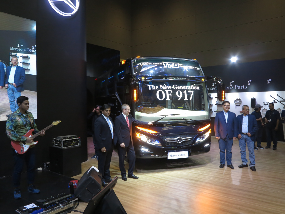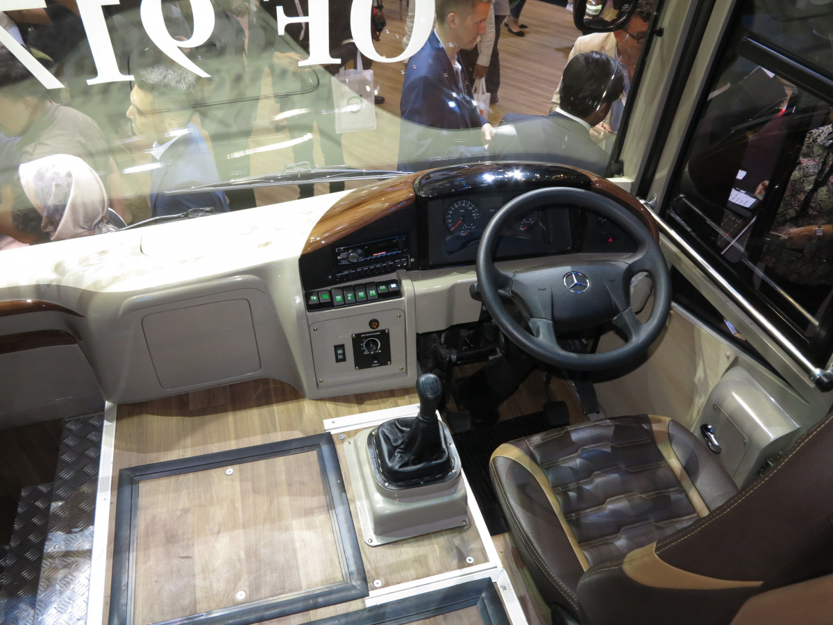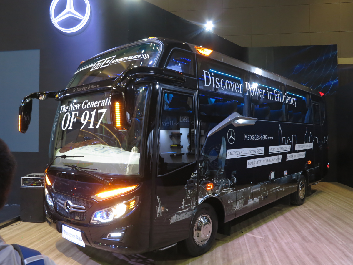 Какие же новинки привезли на выставку в Джакарту? Начнем , с Daimler Buses, который представил новое шасси OF 917 для междугородного автобуса среднего класса, c кузовом от местного ателье Morodadi. Шасси укомплектовано 3,9-литровым турбодизелем 4D34i стандарта Евро 3 – мощностью 170 л. с. (520 Нм). Двигатель находится спереди. Коробка – 6-ступенчатая, механическая (МО36S6) или автоматическая (Allison T2100). Возможны два варианта колесной базы – 4250 мм или 5300 мм. От этого зависит и количество кресел в салоне: 30 – 35 или 35 – 39. Подвеска – рессорная. Шасси рассчитано на полную массу 10 400 кг. Радиус разворота – 9,7 м.