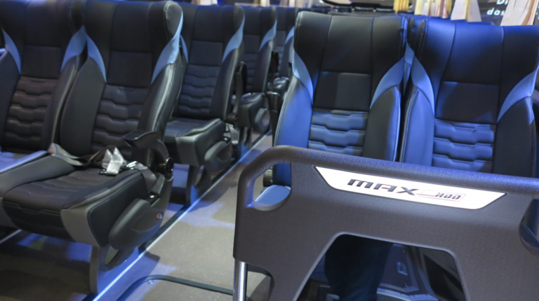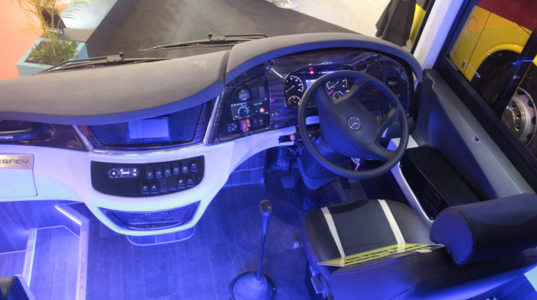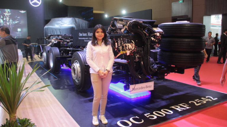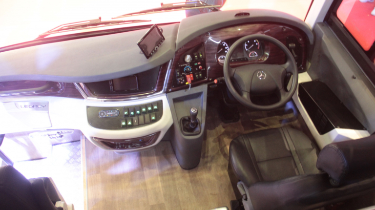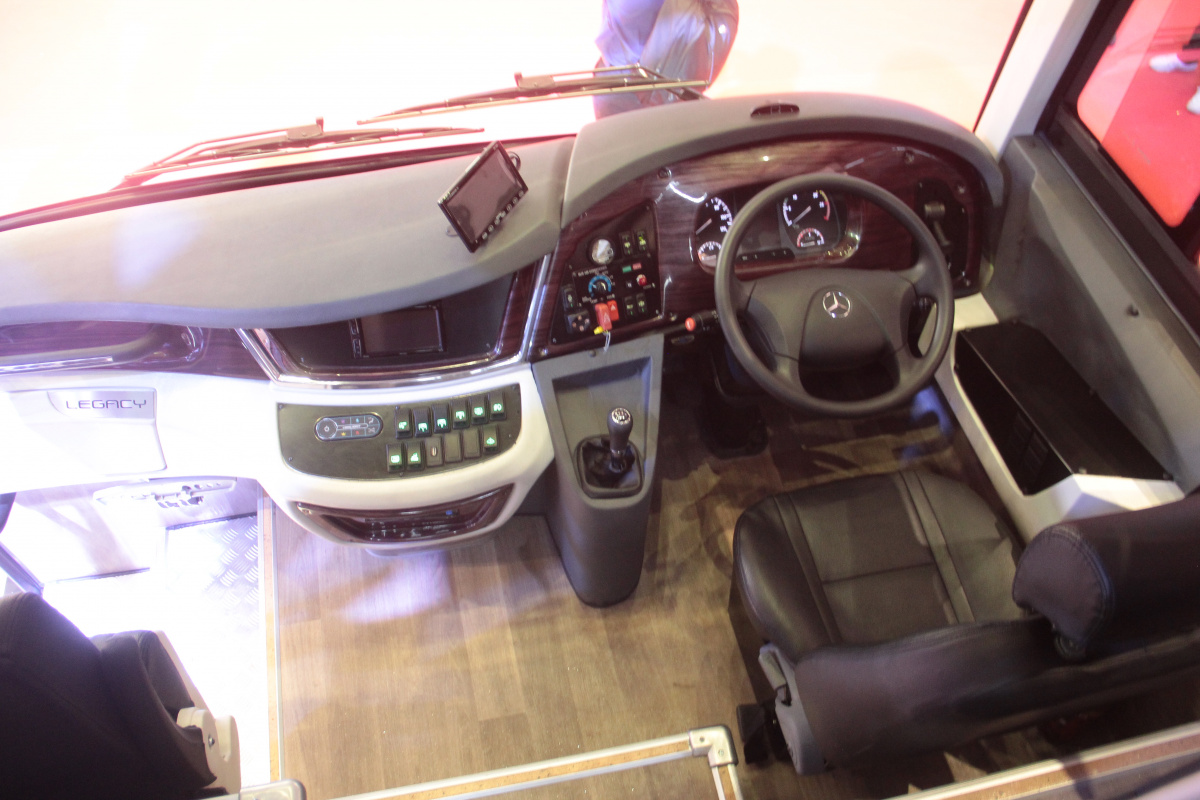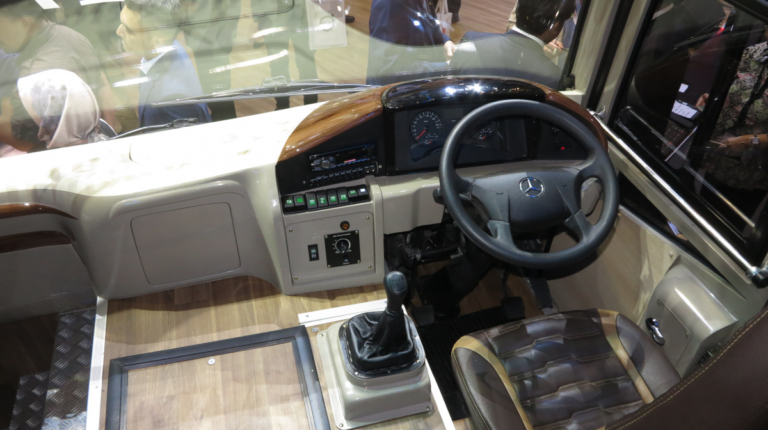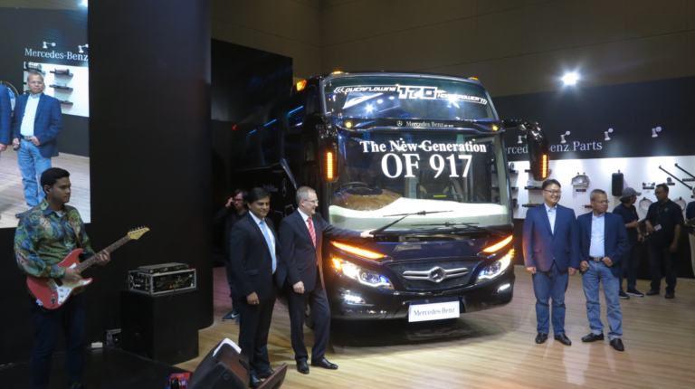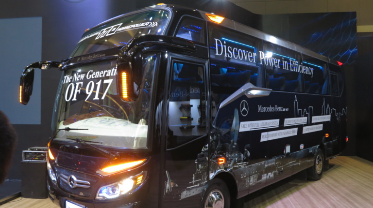 Какие же новинки привезли на выставку в Джакарту? Начнем , с Daimler Buses, который представил новое шасси OF 917 для междугородного автобуса среднего класса, c кузовом от местного ателье Morodadi. Шасси укомплектовано 3,9-литровым турбодизелем 4D34i стандарта Евро 3 – мощностью 170 л. с. (520 Нм). Двигатель находится спереди. Коробка – 6-ступенчатая, механическая (МО36S6) или автоматическая (Allison T2100). Возможны два варианта колесной базы – 4250 мм или 5300 мм. От этого зависит и количество кресел в салоне: 30 – 35 или 35 – 39. Подвеска – рессорная. Шасси рассчитано на полную массу 10 400 кг. Радиус разворота – 9,7 м.