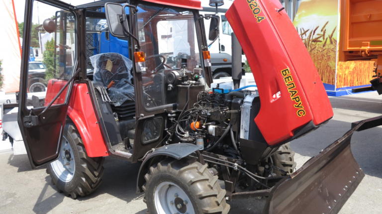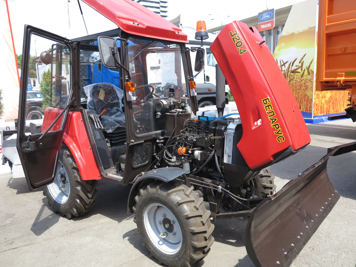 Еще одна представленная модель – Belarus 320.4, которая укомлектована 3-цилиндровым 1,6-литровым дизелем Lombardini мощностью 36 л.с. Грузоподъемность навесного устройства на оси подвеса – 1100 кг, максимальное давление – 200 Мпа, производительность насоса – 17 л/мин. На выставке трактор был показан с передним отвалом.