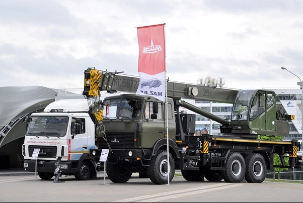 На форуме MILEX 2019 было представлено две модели автотехники МАЗ. На открытой площадке можно увидеть новый автокран, предназначенный для выполнения погрузочно-разгрузочных работ и работ с разрядными (опасными) грузами KC-55727-5-31В. Автокран изготовлен на базе шасси МАЗ-631705-364-600Р4 специально для данной выставки в могилевском подразделении предприятия – заводе “Могилевтрансмаш”.