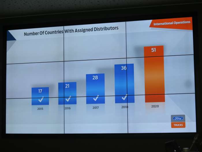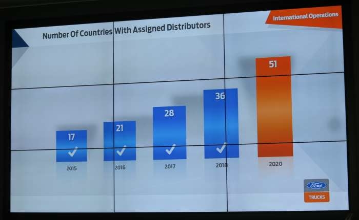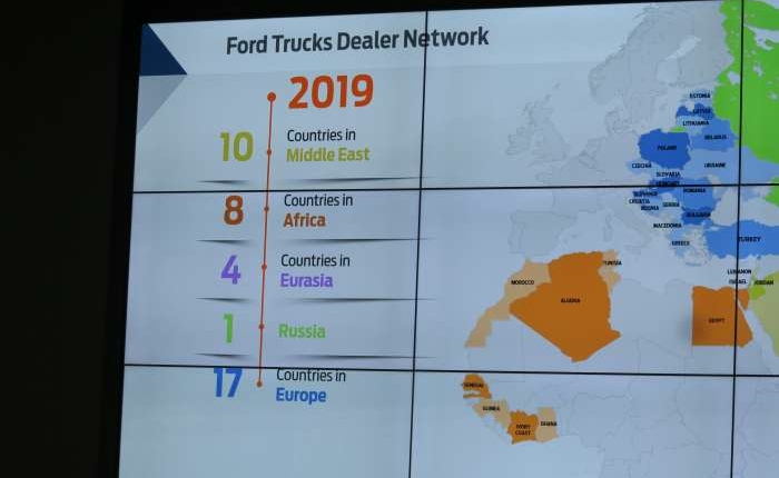 Сегодня на экспорт уходит до 75% всей продукции компании. Если в 2015 году у Ford Trucks были дистрибьюторы в 17 странах, то в 2019-м – уже в 42-х, а в планах на 2020 год намечено расширить географию присутствия до 51-й страны. На Ближнем Востоке функционирует 10 дилерских центров, в Африке – 8, в странах Евразии – 4, в России – 1 и в Европе – 17. Стратегическая цель – охватить 15 стран Западной Европы. Уже сегодня Ford Trucks имеет довольно развитую сервисную сеть по всей Европе – СТО находятся друг от друга на расстоянии не более 150 км.