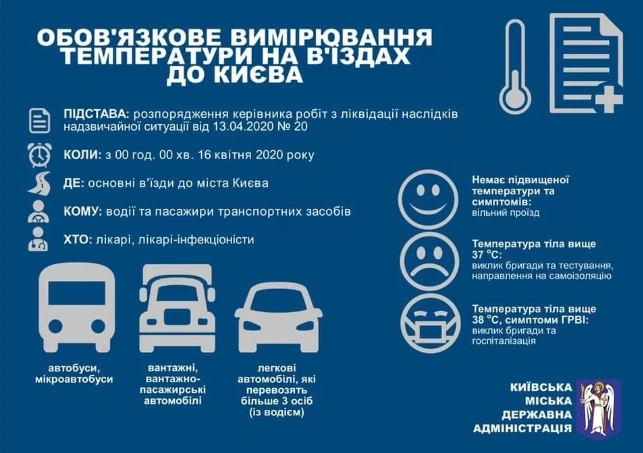 Зокрема, буде запроваджено обов'язковий температурний скринінг усіх пасажирів транспортних засобів, які прямують до Києва. Перевірятимуть автобуси, вантажний і пасажирський транспорт, а також легкові автомобілі, які перевозять більше трьох осіб (разом із водієм).