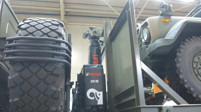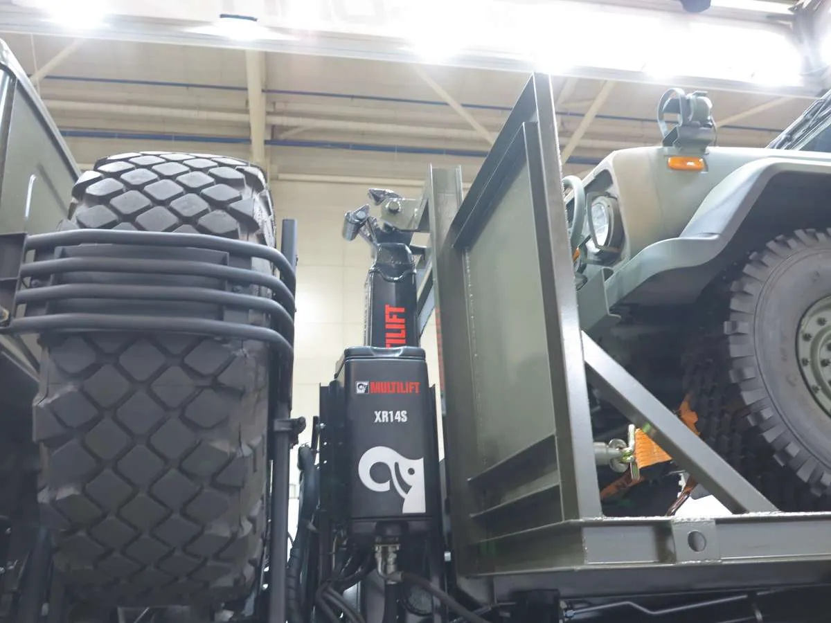 Машина оснащена крюковым погрузчиком Multilift XR14S.51 грузоподъемностью 10 000 кг. Он позволяет всего за 60 секунд погрузить или разгрузить стандартный морской контейнер или грузовую платформу с военной техникой: на выставке эту роль выполнял армейский внедорожник «Богдан (KIA) KM-450».