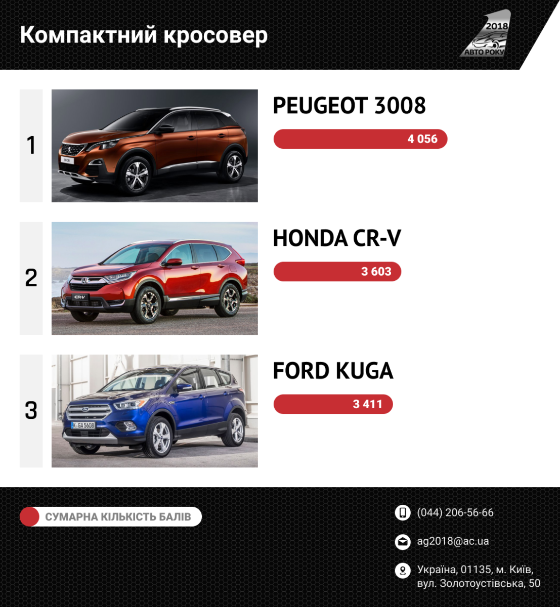 Названий переможець конкурсу «Автомобіль року в Україні 2018» в номінації «Компактний кросовер». У популярній категорії кращим став Peugeot 3008.