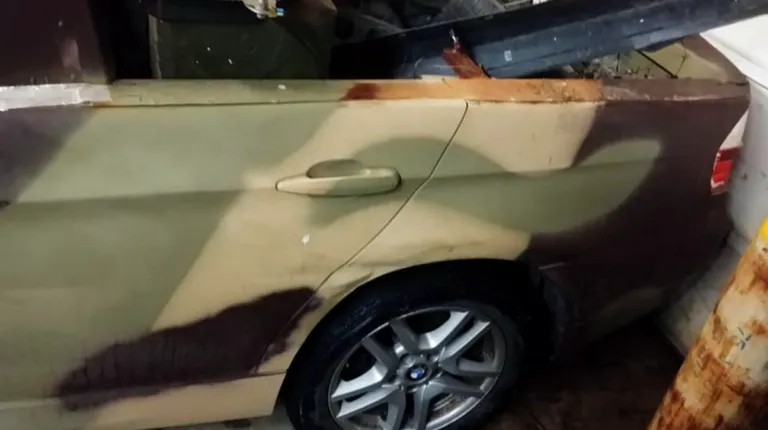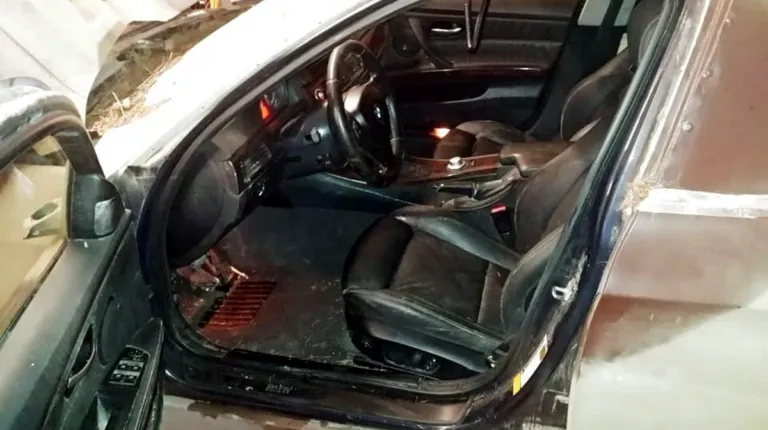 Лобовое стекло на пикапе и вовсе из плексигласа и при этом довольно затертое. Интерьер довольно потрепанный. В кузове, за кабиной установлены запаска и канистра. Пикап BMW также получил камуфляжный окрас в духе армейской техники и таинственные знак «ККК» на переднем крыле. Задние двери оставили, но, по всей видимости, они не функционируют.