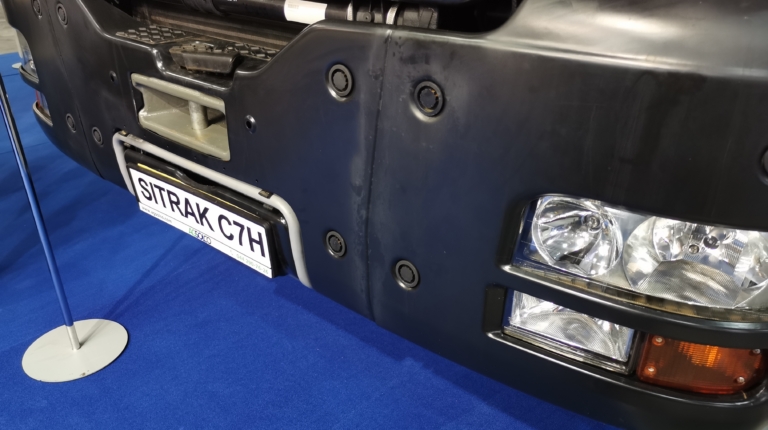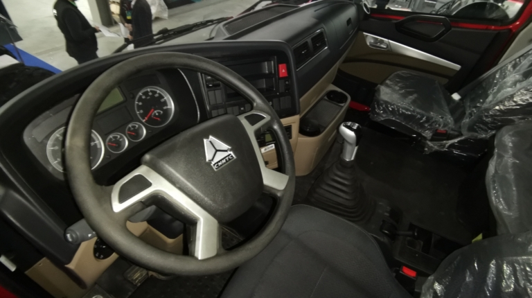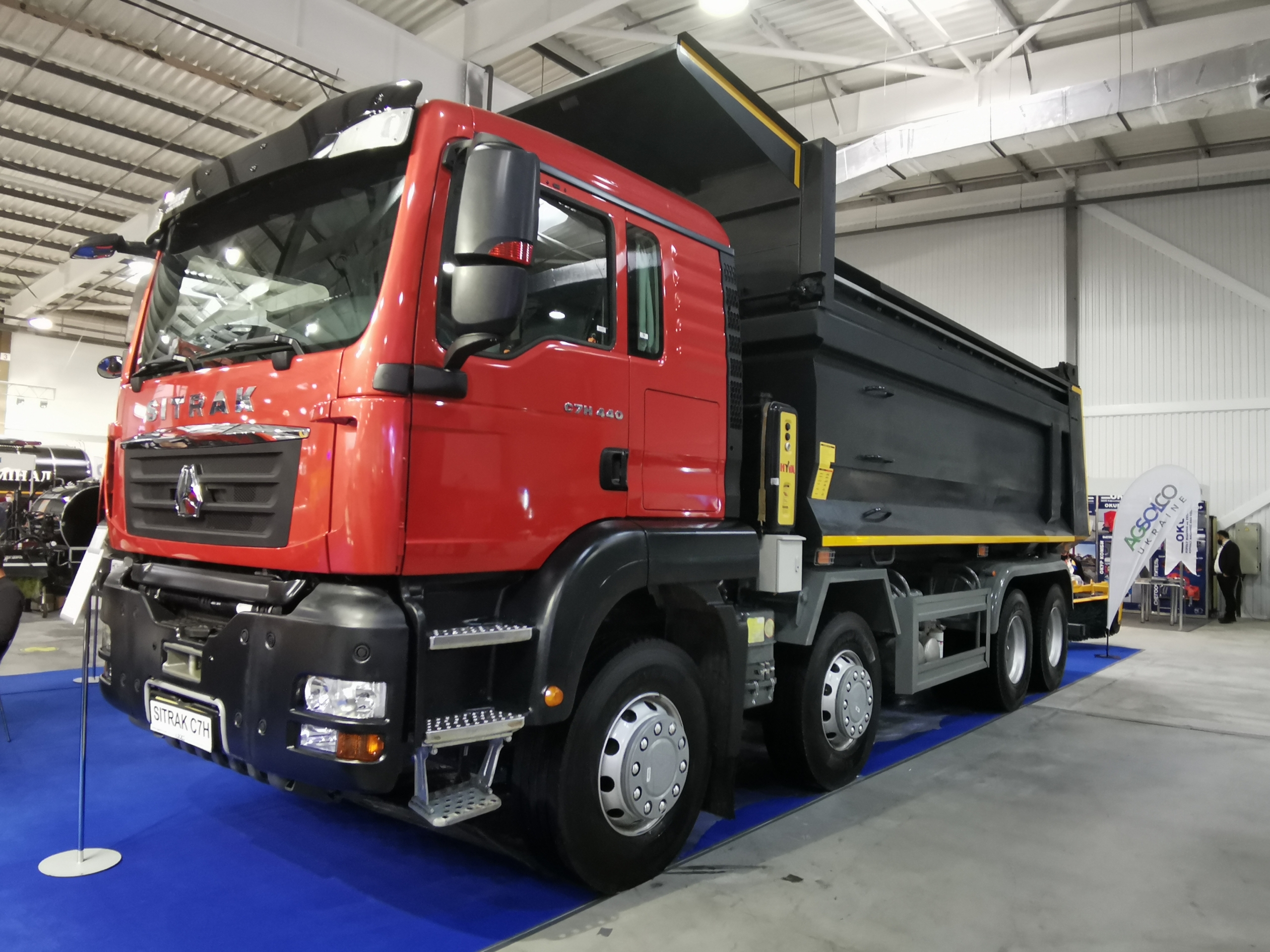 На стенде «Агсолко Украина» представлен еще один самосвал – машина премиального бренда Sitrak C7H колесной формулы 8х4. На модели используется не только двигатель и мосты MAN, но и кабина, изготовленная по лицензии этого немецкого производителя. Полная масса составляет 51 000 кг. Нагрузка на передние оси – 9500+9500 кг, на задние – 32 000 кг. Грузоподъемность – 33 000 кг. Кузов полезным объемом 23 м куб. изготовлен из стали K450. Двигатель и трансмиссия здесь такие же, как и на вышеуказанном самосвале Hohan. Цена такого самосвала – – 106 700 долларов.