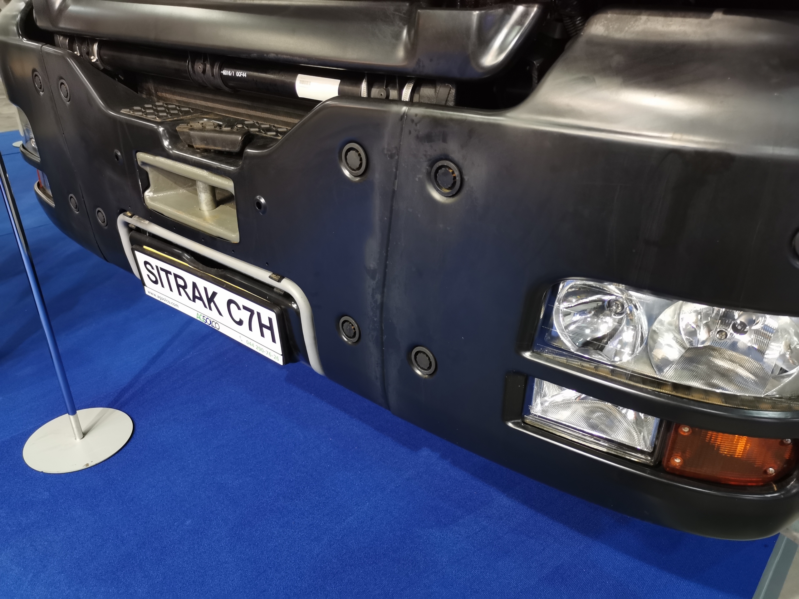 Компания «Агсолко Украина» привезла на выставку новинку – самосвал Sinotruk N7G (Hohan) колесной формулы 6х4. Машина привлекает внимание своим дизайном кабины, достаточно посмотреть на решетку радиатора и фары. В конструкции применены передовые технологии – двигатель и мосты изготовлены по лицензии MAN (немецкий производитель владеет 25% акций Sinotruk). Снаряженного масса автомобиля составляет 15 000 кг, а грузоподъемность – 26 500 кг. Нагрузка на переднюю ось – 9500 кг, а на задние – 32 000 кг.