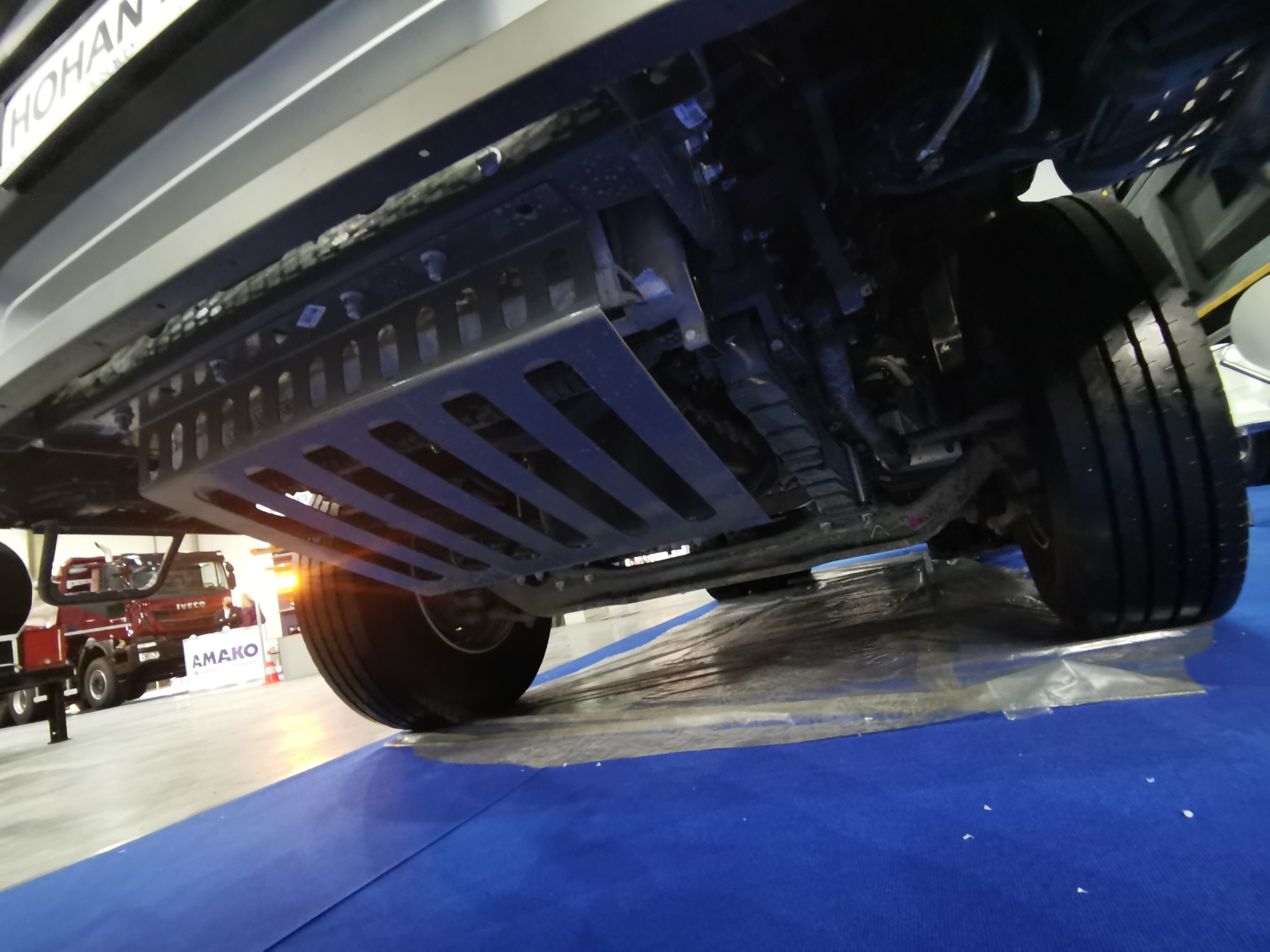 Кузов из стали Hardox, в асфальтовом исполнении, то есть они имеет систему подогрева, термический тент, который скручивается на правую сторону – это позволяет водителю не ходить по грузу, чтобы накрыть кузов. В задней части платформы установлен удлинитель, для того чтобы груз высыпался как можно дальше – в бункер асфальтоукладчика. А чтобы самосвал как можно ближе подъезжал к асфальтоукладчику задний бампер (брус противоподкатной защиты) сделан подъемным.