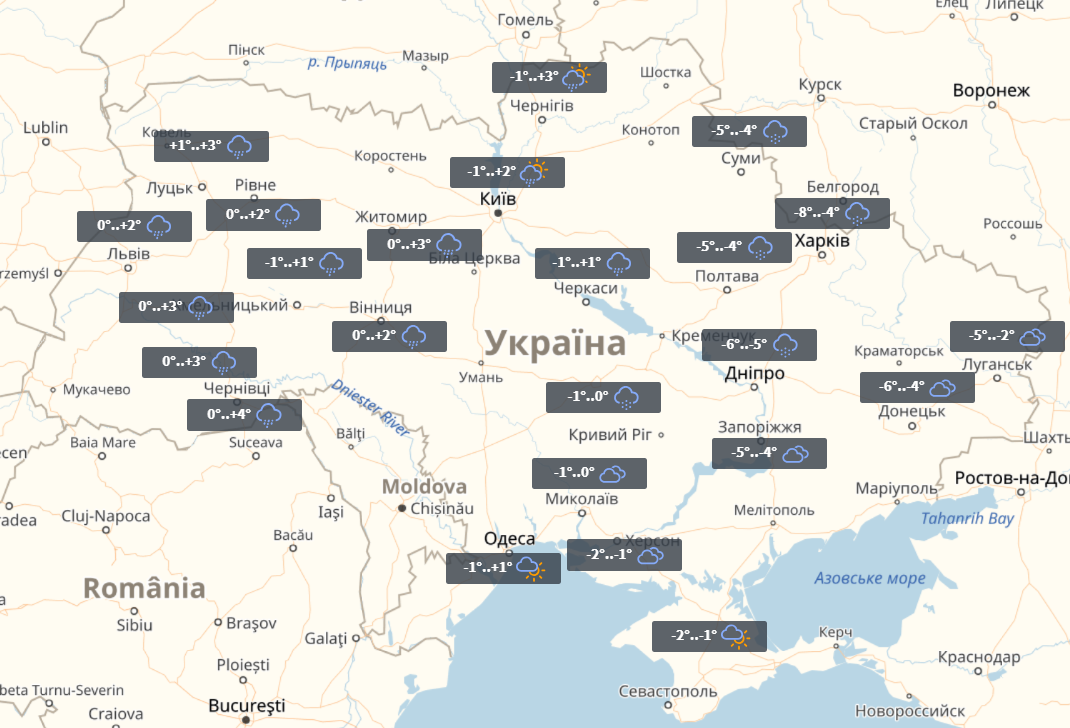 У північних і центральних областях очікується рясне випадання снігу, температура до +2, +3°С. На заході України пройде сніг з дощем, температура до +4°С. На сході майже без опадів, температура до -4°С. На півдні – мінлива хмарність, температура до + 1°С.