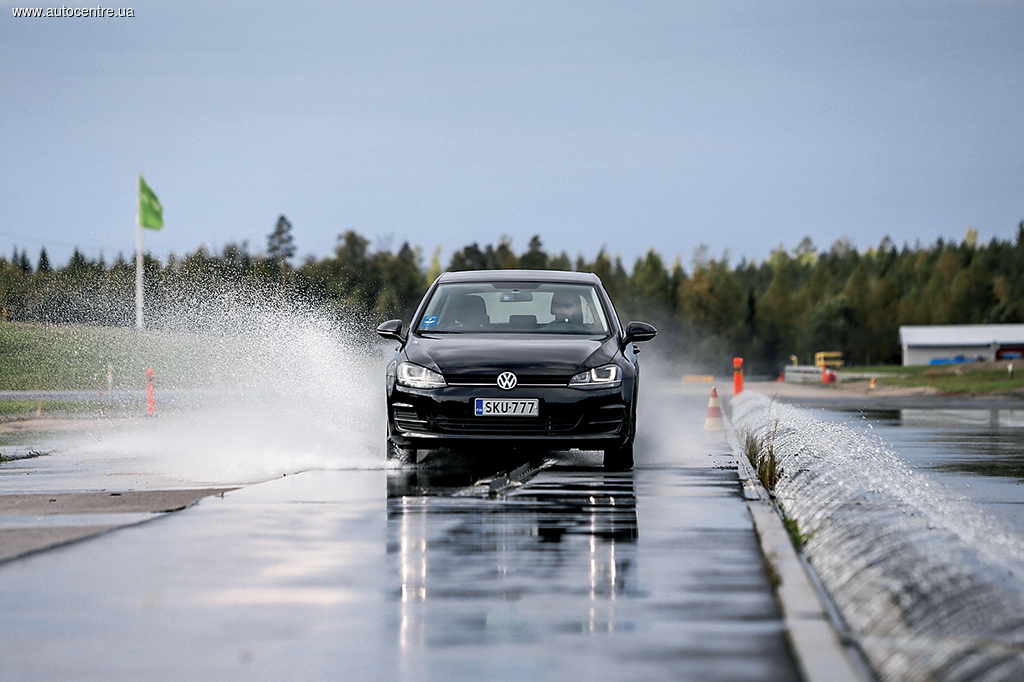 У новых шин размерностью 195/65 R15, установленных на автомобиль гольф-класса (в снаряженном состоянии и с одним водителем), при 10-миллиметровом слое воды аквапланирование может начаться в диапазоне скоростей от 65 до 95 км/ч. На какой именно скорости это произойдет, зависит уже от конкретной модели шины. Ввиду этого автовладельцам было бы полезно поинтересоваться тестами покрышек, чтобы понимать, с какими скоростями можно безопасно ездить на шинах, которыми укомплектован ваш автомобиль.