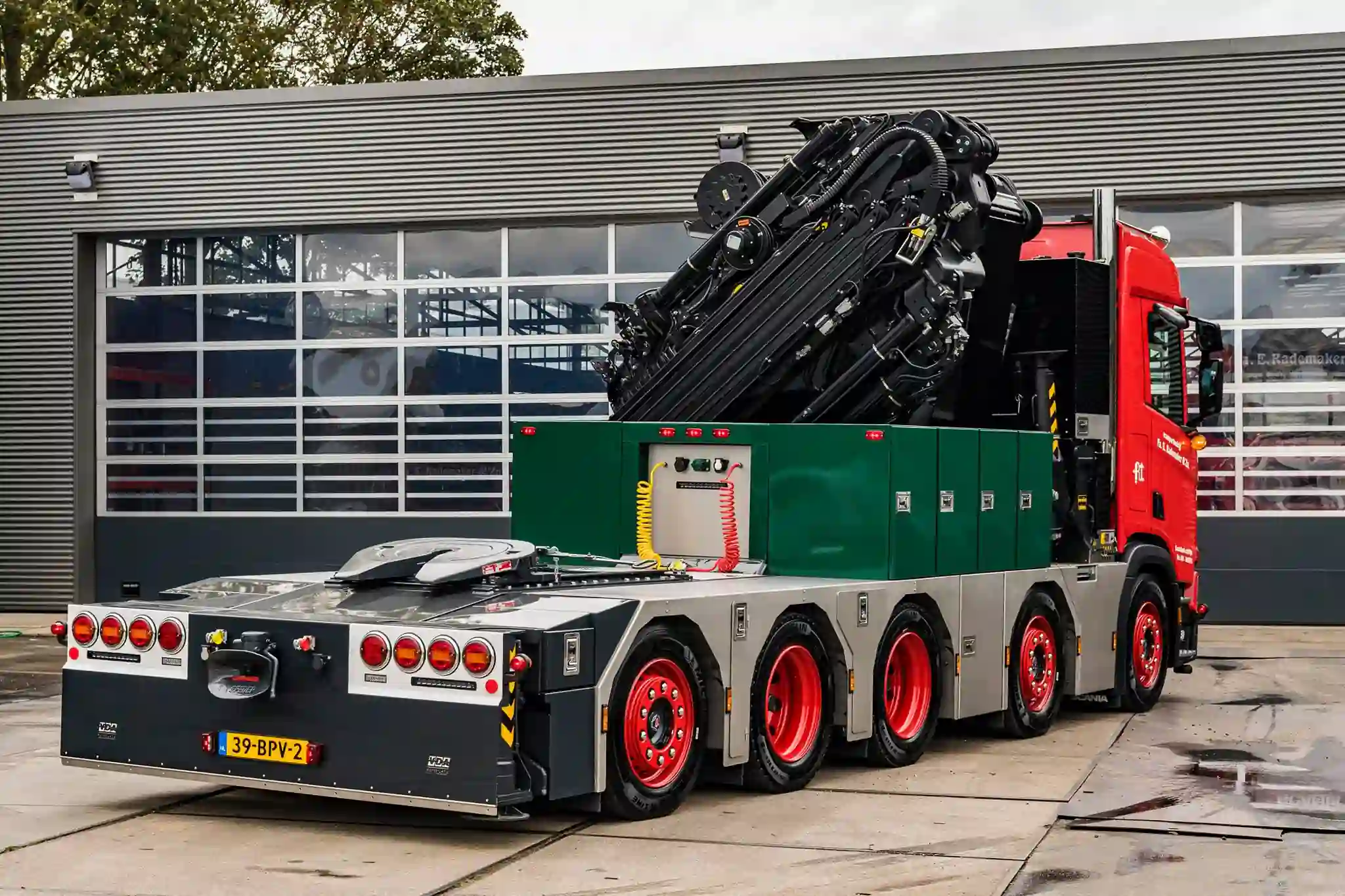 А теперь поговорим о силовой установке. Шасси Scania R 500 10x4 с представленным краном-манипулятором получилось нелегким – полной массой 45 т. Раньше на подобные машины данного производителя компания Rademaker Transport заказывала двигатели V8, однако теперь отдала предпочтение 6-цилиндровому R500.