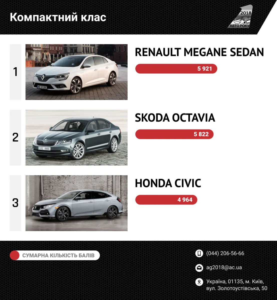 Треба сказати, що до останнього дня голосування Renault Megane Sedan і Skoda Octavia йшли буквально «ніс у ніс». Однак, за сумарними підрахунками голосів журналістського і громадського журі, з відривом майже в 100 балів Меган все ж оминув досить сильного чеського суперника. Втім, і Шкоді довелося непросто - їй «наступала на п'яти» нова Honda Civic, яка посіла 3-е місце в своєму класі.