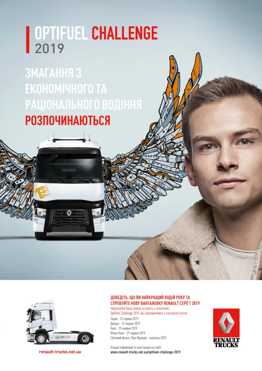 Компанія Renault Trucks в Україні запрошує водіїв вантажних автомобілів взяти участь в змаганнях по економічному і раціональному водінню Optifuel Challenge 2019. Цей конкурс проводиться в Україні вже втретє і пройде в кілька етапів. Перший пройде 23 травня у Львові, другий – 13 червня в Дніпрі і заключний етап – 25 червня в Києві.