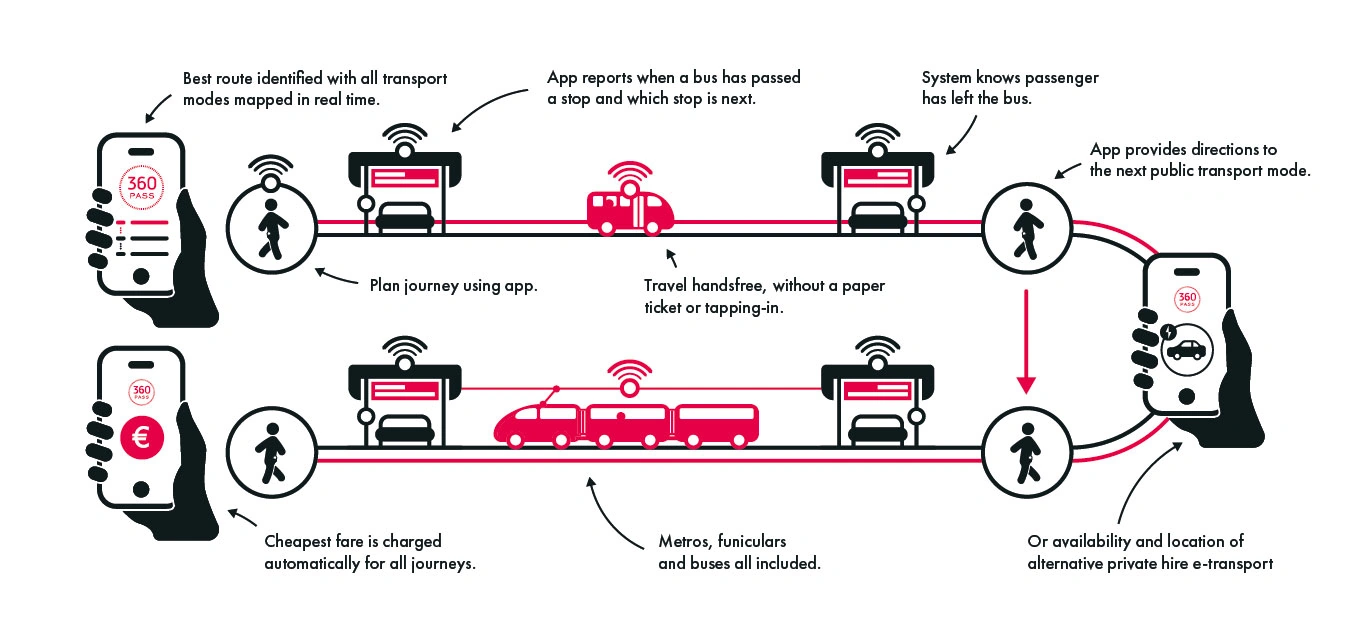 Інтелектуальний додаток Hitachi 360Pass для продажу квитків підключає датчики Bluetooth, які знають, коли пасажир з мобільним додатком сів на борт, як далеко він проїхав і коли вийшов. Система 360Pass гарантує, що користувачі будуть платити тільки по найкращому тарифу в кінці кожного дня.