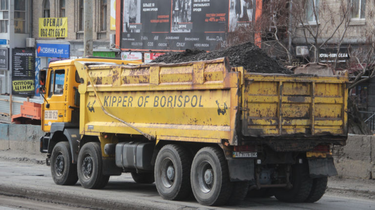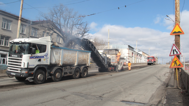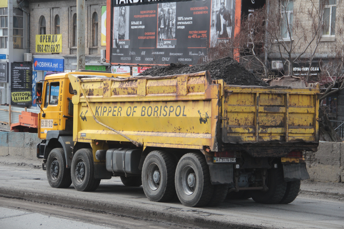 А пока на мосту работает фреза по асфальту Writgen на четырех гусеницах. Что же касается автотехники, то здесь можно увидеть несколько самосвалов повышенной грузоподъемности. Среди них грузовики MAN 50.403 и 19.403 – колесной формулы 8х8 и 8х4 соответственно. Они оснащены кузовами увеличенного объема. Эти машины, судя по наклейкам на дверях, приехали из Борисполя. Также по вывозу старого асфальта работает и четырехосный самосвал Scania 124 C420 с огромным кузовом с арабскими надписями на нем.