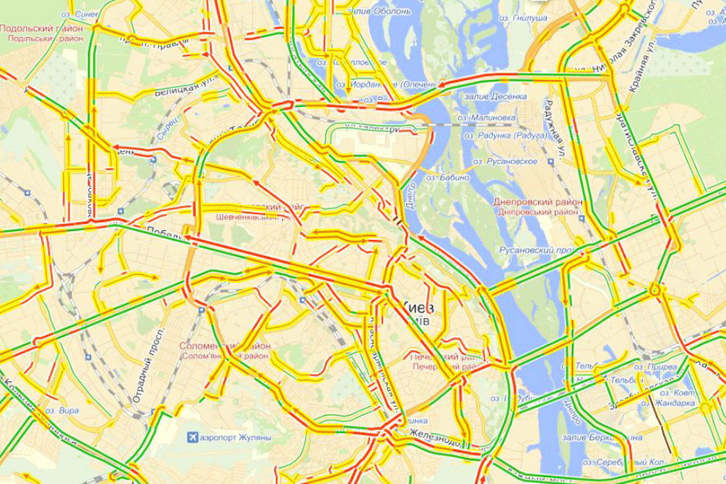 В этот же день, 20 ноября, но уже вечером – в 18:50 образовалась пробка длиной 8,1 км – по маршруту: улица Набережно-Луговая, Набережно-Крещатицкая улица, Набережное шоссе; от Межигорской улицы до бульвара Дружбы Народов.