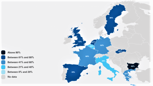Залежно від країни в Європі вплив COVID-19 на галузь різниться. Так, у Великій Британії це мінус 73% обсягу перевезень, у Німеччині — 53%, Франції — 59%, Іспанії — 90%, Бельгії — 40%, Болгарії — 92%. Повідомляється, що в Нідерландах втрати обороту можуть досягати 90% для окремих компаній, але в цілому за даними IRU — 61%. Голландська організація KNV бачить кращий варіант розвитку сценарію — це банкрутство 40% компаній. У Швеції пасажирський транспорт втратив до 90% своїх доходів практично одразу, але уряд оголосив, що заходи фінансової підтримки будуть продовжені ще на три місяці.
