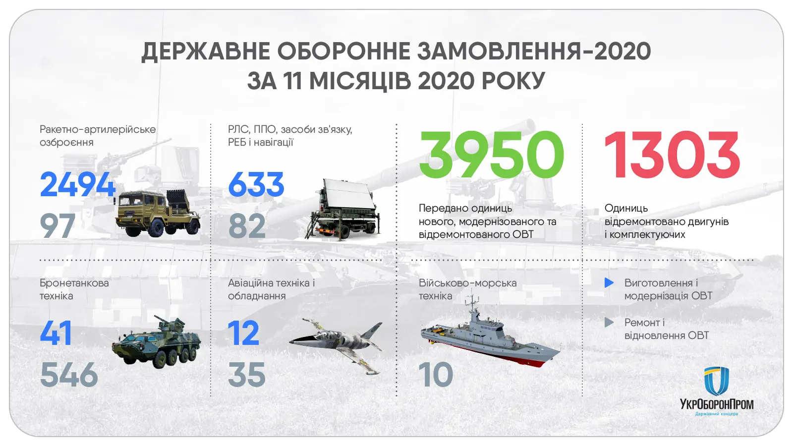 Загалом замовники вже отримали 3950 нових, модернізованих та відремонтованих одиниць ОВТ, з яких 2591 — ракетно-артилерійське озброєння; 715 — радіолокаційні станції, ППО, засоби зв'язку, радіоборотьби та навігації; 587 — бронетанкова техніка; 47 — авіаційна техніка та обладнання; 10 — військово-морська техніка. Крім того, підприємства Укроборонпрому відремонтували і передали 1303 одиниці двигунів і деталей.