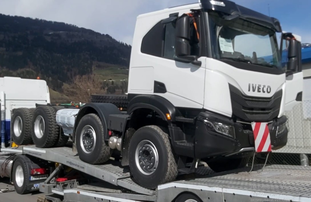 Однако в сеть все же просочились первые изображения IVECO T-Way. Короткое видео было снято во время транспортировки четырехосного шасси на трейлере одним из водителей. О том, что это именно T-Way красноречиво говорит шильдик на открытой двери, по которому видно, что машина оснащена 510-сильным двигателем.