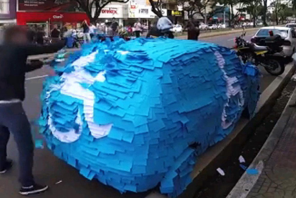 Бразилия – страна карнавала и вечного праздника. Однако, что касается соблюдения водителями ПДД, то здесь не все так радостно. В последнее время в больших городах обострилась ситуация с парковкой автомобилей в неположенных местах, что однозначно мешает другим участникам движения. Особенно вопиющими стали случаи, когда машины занимают места, предназначенные для транспортных средств людей с ограниченными возможностями. Водителям-инвалидам и так нелегко дается посадка-высадка. А тут еще и место законное занимают. Поэтому волонтерские организации нашли способ борьбы с такой несправедливостью. Автомобиль-нарушителя полностью обклеивают соответствующими наклейками с изображением инвалидной коляски. То, что чувствует владелец такой машины, можно увидеть на видео. Бедняга пытается как можно скорее сорвать наклейки, но это сделать не так-то легко. Ему даже в этом помогает полицейский, оперативно прибывший на мотоцикле. Опозоренный, нарушитель все же уезжает под радостные возгласы, явно не сочувствующей ему толпы.
