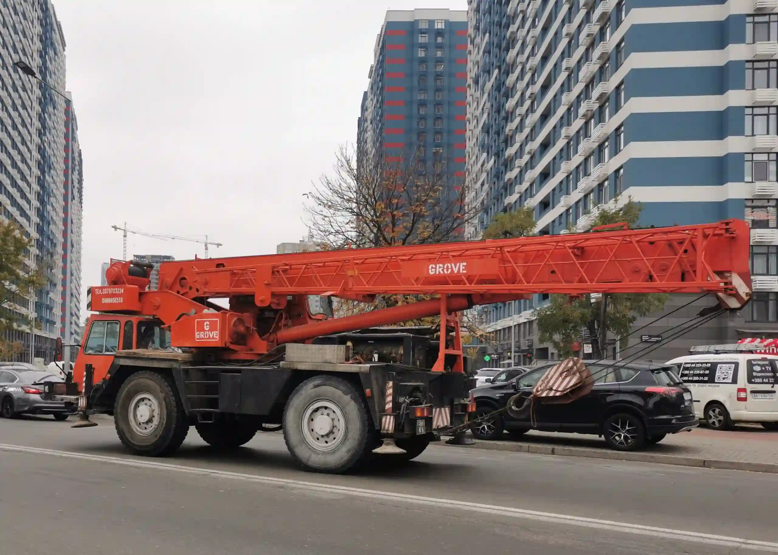 Зазначимо, що мобільні автокрани Grove класу All Terrain дуже популярні в Україні. Останнім часом ми вже двічі писали про цікаві моделі, що працюють у Києві. Це чотиривісна машина GME 4100-L, яка допомагала демонтувати фонтанний комплекс на Русанівці, а також 150-тонна шестивісна TM1500, задіяна у завантаженні військової техніки у Музеї історії України у Другій світовій війні.