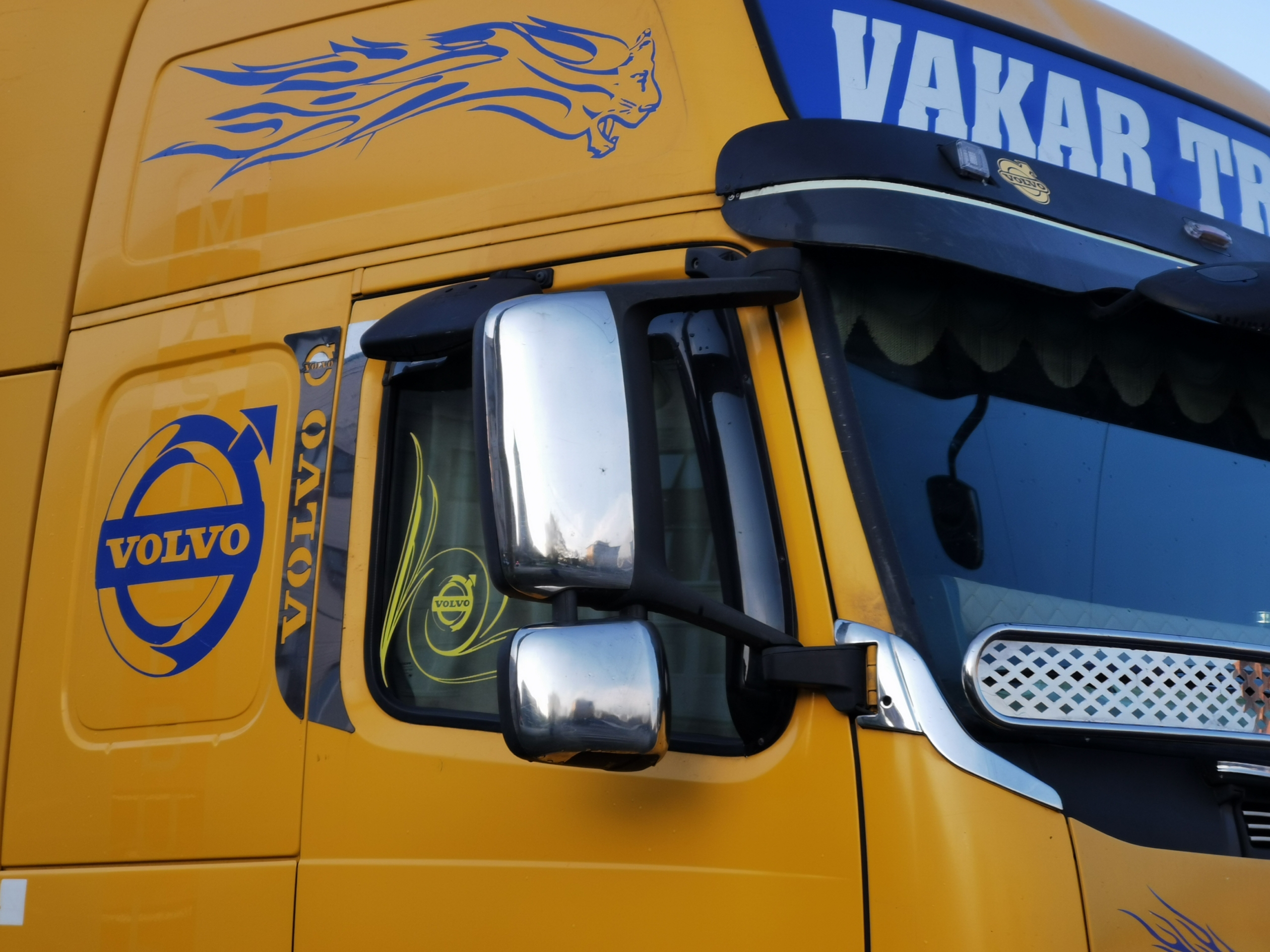 Водій застосував багато хромованих елементів — вони і під бампером, і на передній панелі, і на повітроводах із боків від решітки радіатора, і на самій решітці радіатора. Ефектне і забарвлення — по жовтій кабіні синім намальовані не тільки емблеми Volvo, але і образ мчить царя звірів — лева.