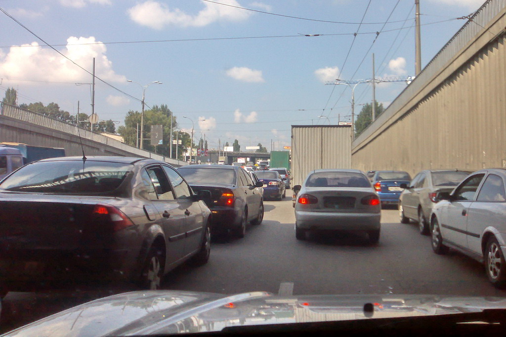 Всему виной – 8-метровая яма на ул. Телиги. Напомним, там в субботу после очередного ливня провалился асфальт на полосе в сторону Шулявки. Для ремонта направление полностью перекрыли, и в итоге полностью закупорились Оболонь, Петровка, Троещина и Подол, через который злосчастную дыру и объезжали. Всех, кто подъезжал со стороны Петровки к ул. Телиги, сотрудники ГАИ отправляли на объезд через ул. Фрунзе, по Петропавловской (кстати, там уже официально двухстороннее движение), Бакинской и Ольжича.
